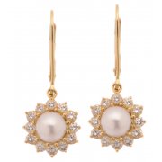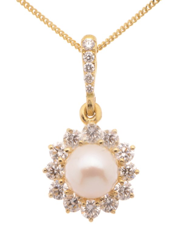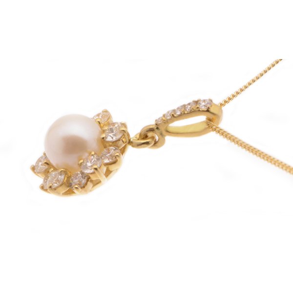 A round freshwater cultured white pearl pendant with round brilliant cut diamonds set into the halo and loop.