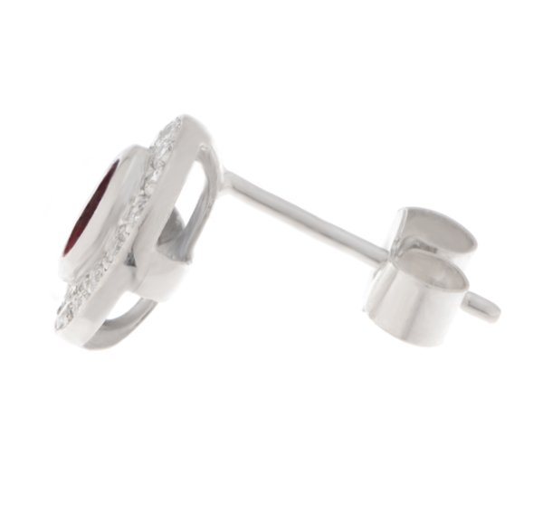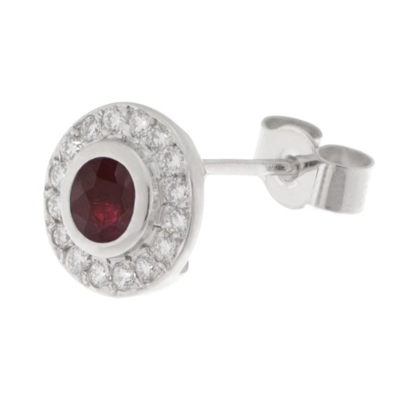 This a timeless design, cluster style earrings with rubover set central round rubies with a halo of grain set round brilliant cut diamonds.