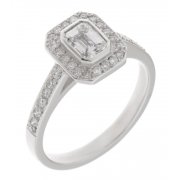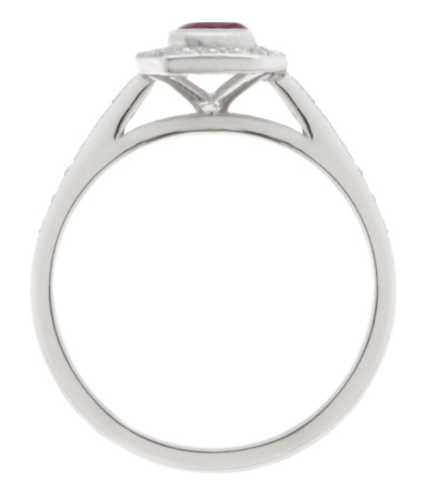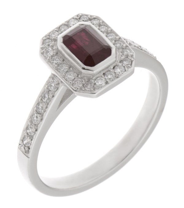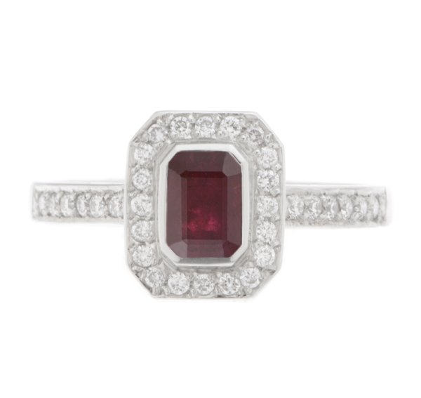 A classic Art Deco style cluster ring with an emerald cut or octagon shaped ruby centre stone with a rubover setting and grain set round brilliant cut diamonds set in to the shoulders and halo surround.