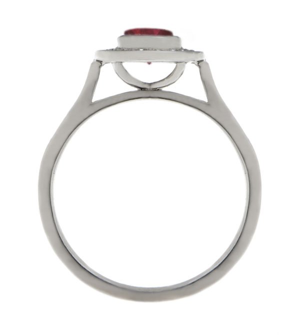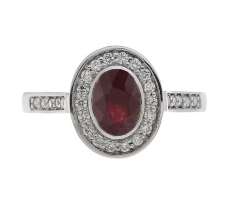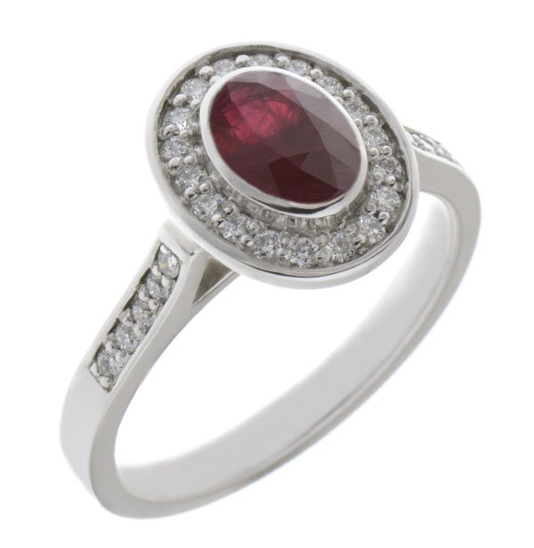 A vintage style oval ruby halo cluster ring with grain set round brilliant cut diamonds in the surround and shoulders.