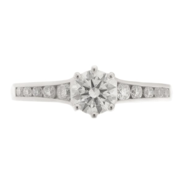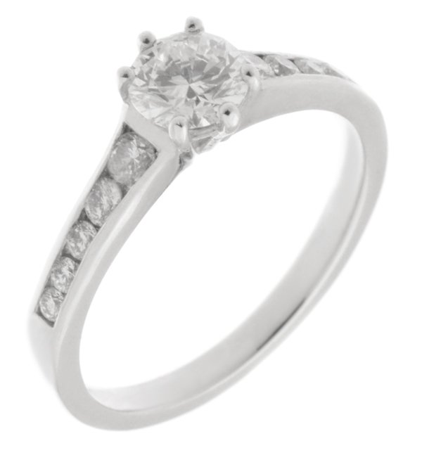 A classic 6 claw solitaire round brilliant cut diamond engagement ring with tapered size round brilliant cut diamond channel set shoulders.