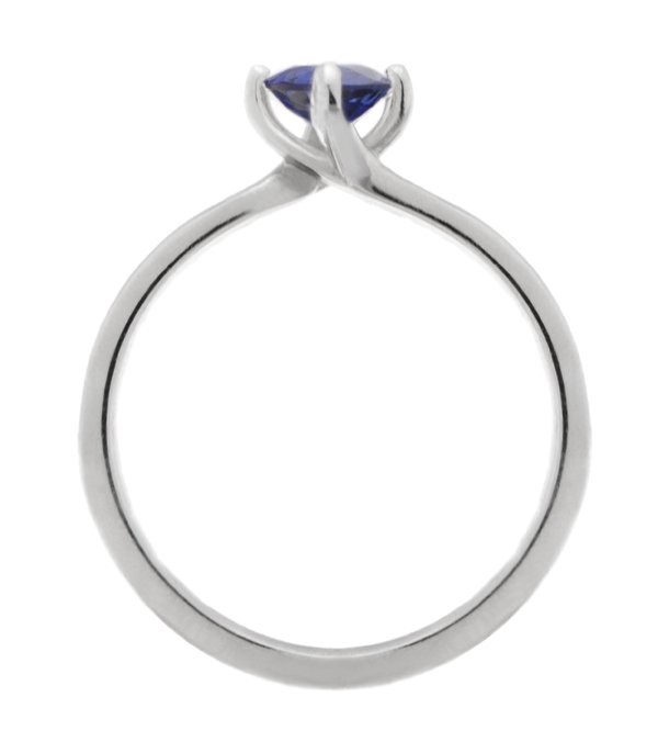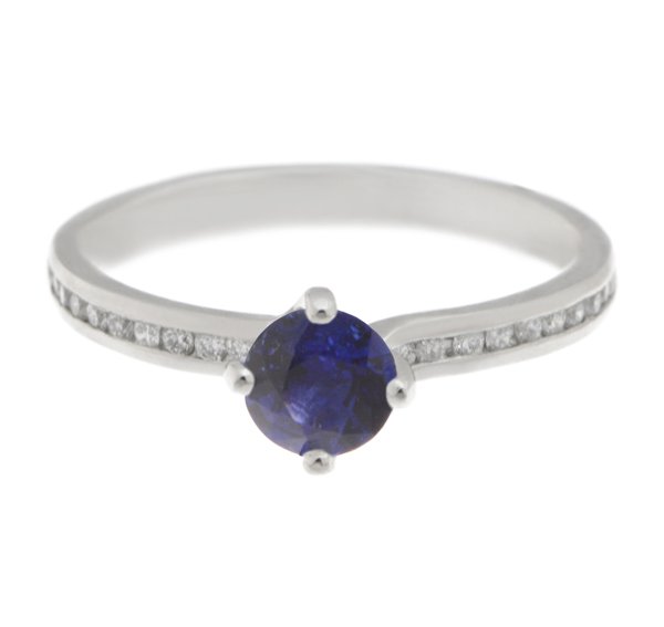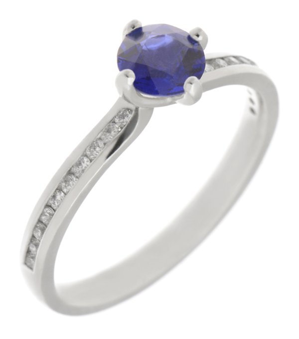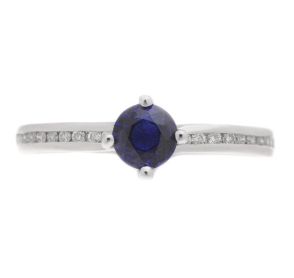 An elegant four claw solitaire round blue sapphire ring design with a twist style to the setting & channel set round diamonds in the shoulders.