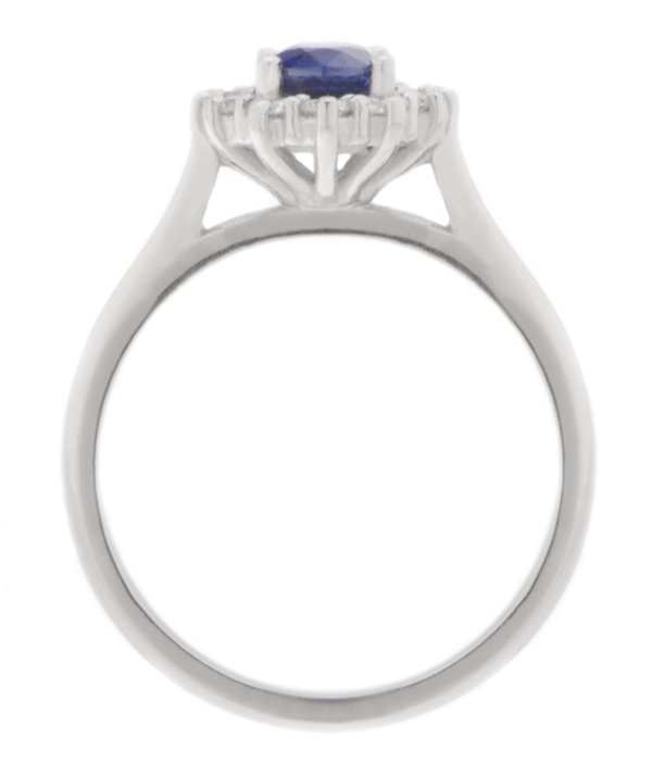 A classic oval blue sapphire cluster ring with a halo of claw set round brilliant cut diamonds.