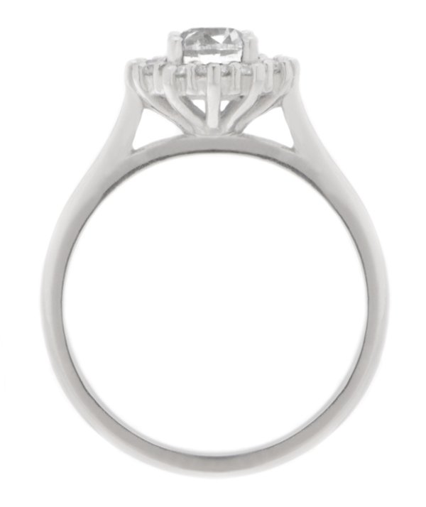 A classic vintage style oval cut centre diamond cluster ring with a halo of claw set round brilliant cut diamonds.