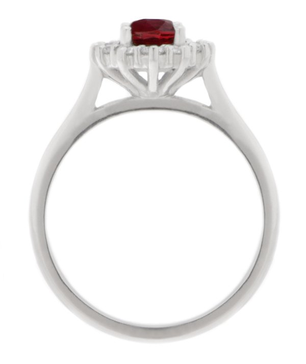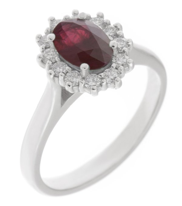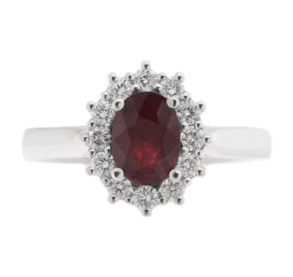 A classic oval ruby cluster ring with a halo of claw set round brilliant cut diamonds.