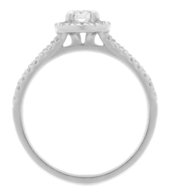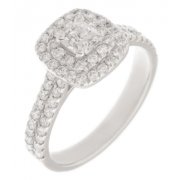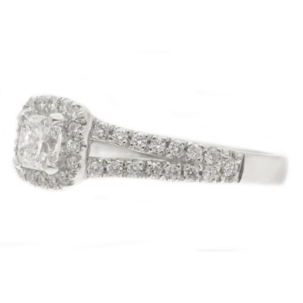 A classic cushion cut diamond halo, cluster engagement ring with claw set round diamonds set into the surround & split or double shoulders.