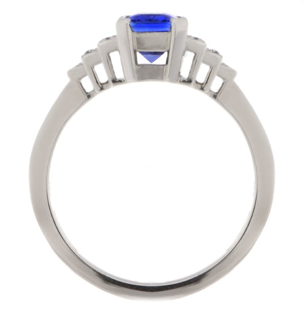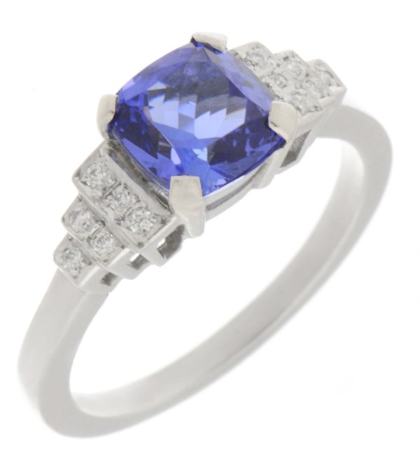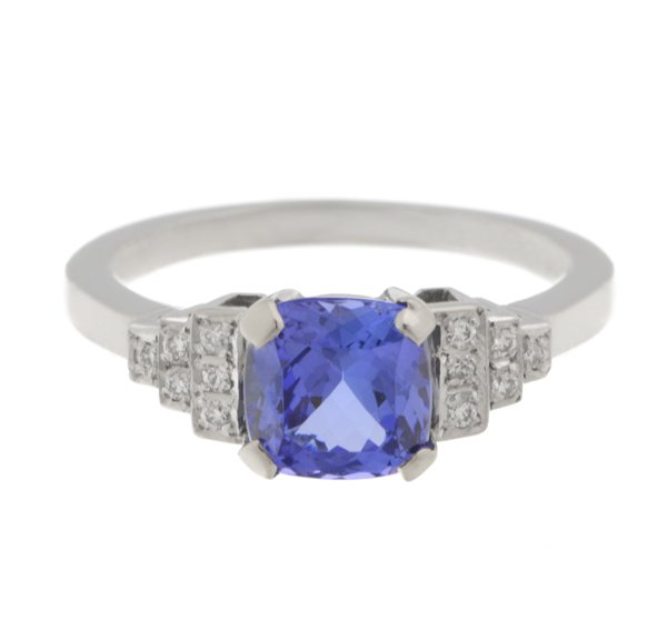 A cushion shape tanzanite ring with art deco style stepped style shoulders, grain set with round brilliant cut diamonds.
