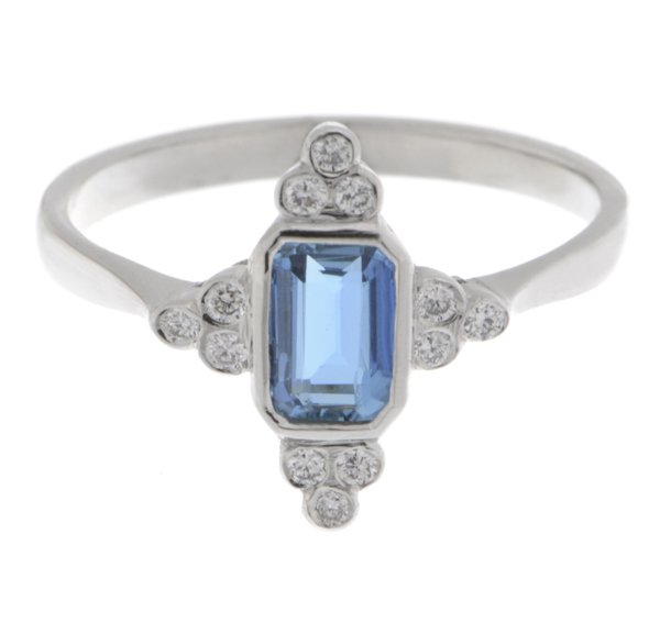 A classic art deco cluster style ring with an emerald or octagon cut aquamarine centre stone and trilogy clusters of round brilliant cut diamonds top, bottom and sides.