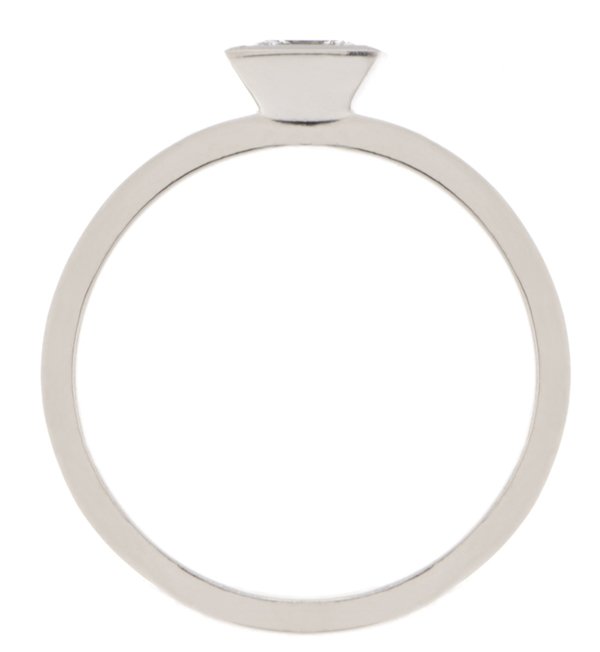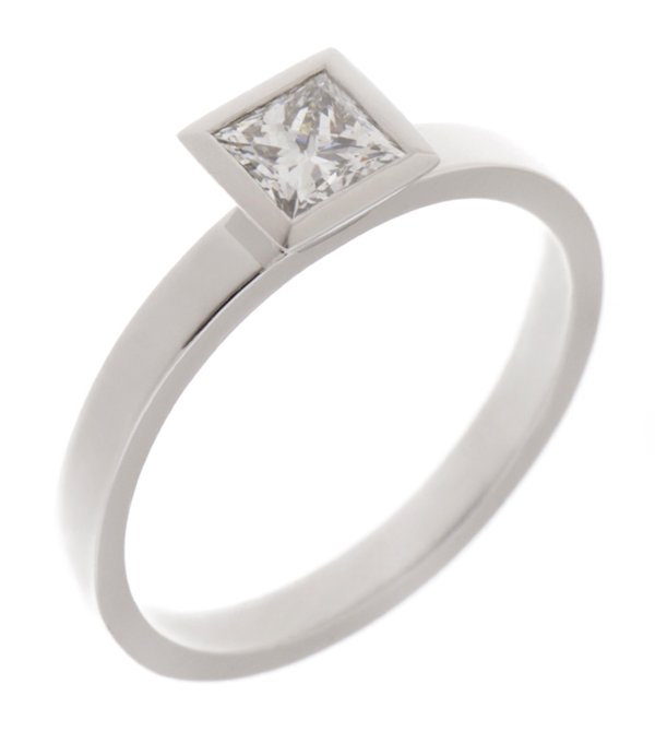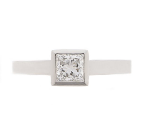 A modern solitaire rubover set princess cut diamond engagement ring with flat shoulders.