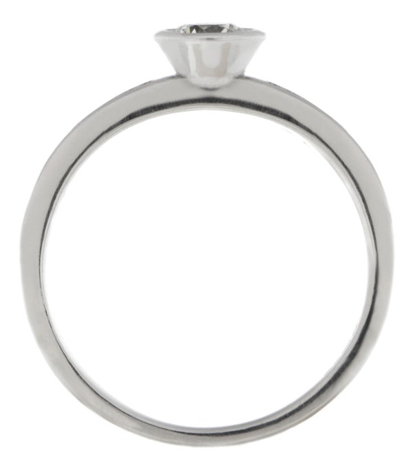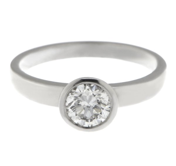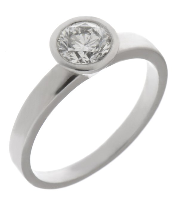 A modern solitaire rubover set round brilliant cut diamond engagement ring with flat shoulders.