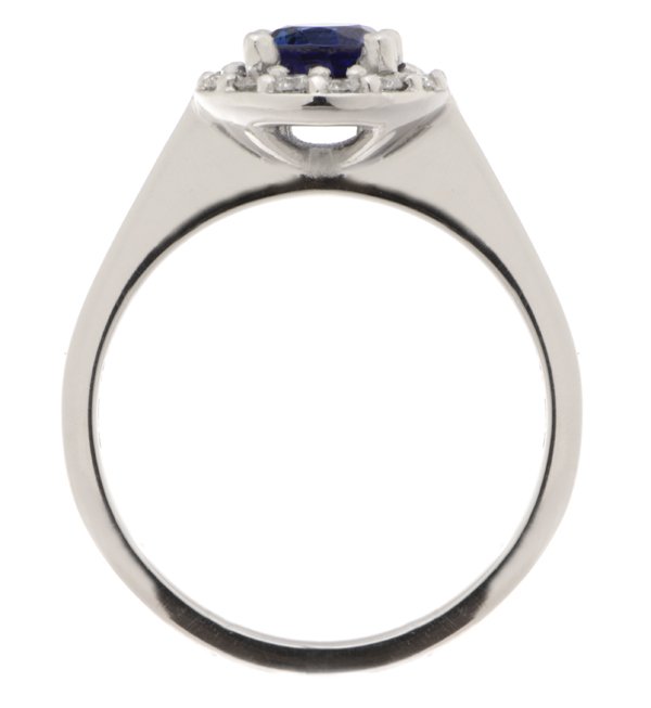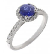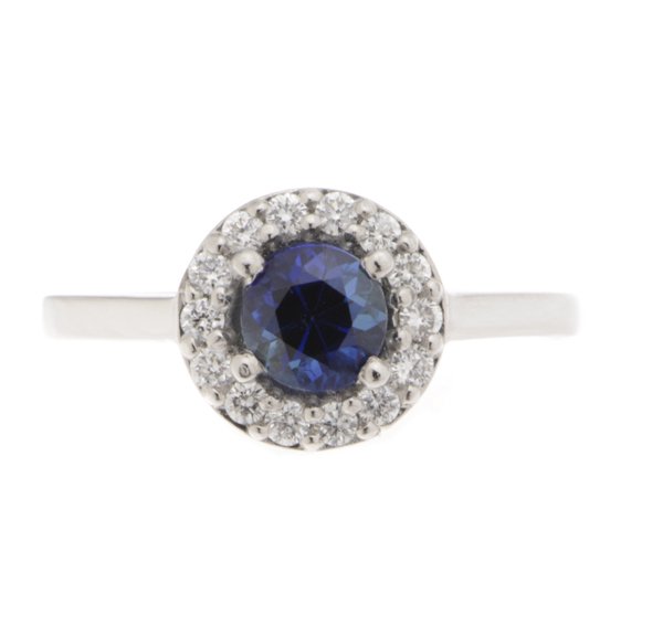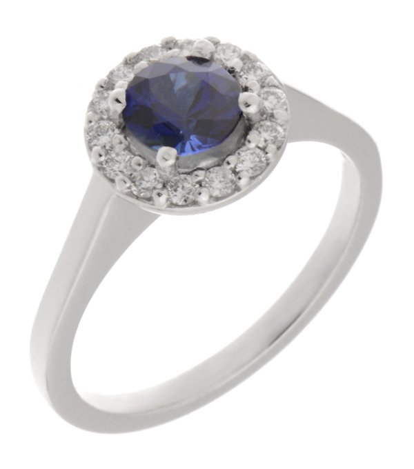 A classic halo style cluster ring with a round blue sapphire centre stone, claw set round brilliant cut diamonds halo and plain flat shoulders.