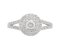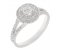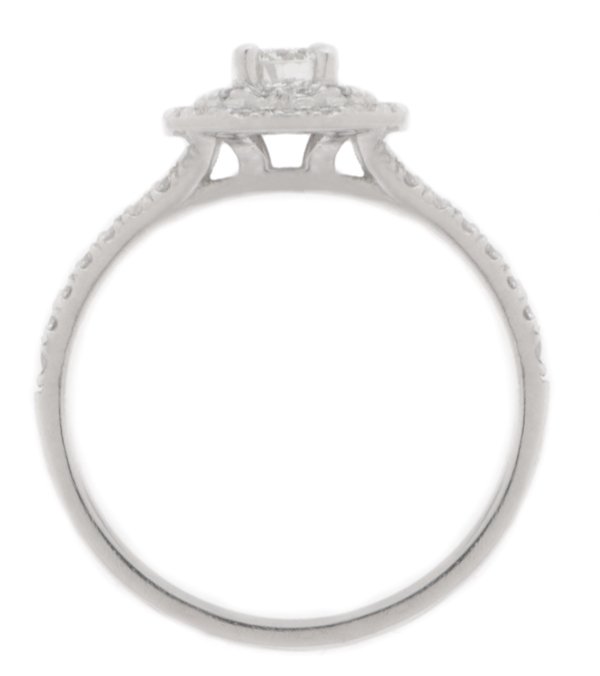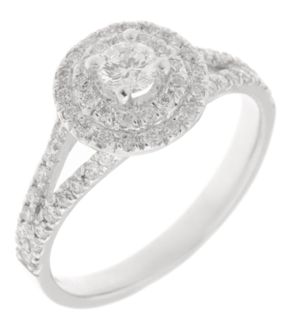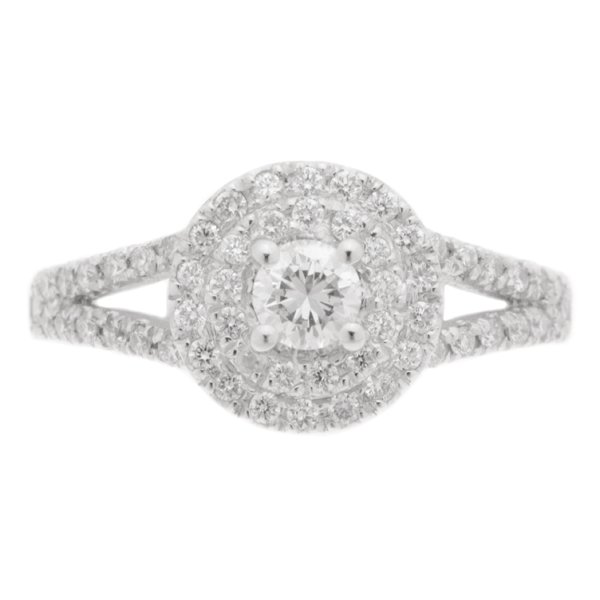 A classic double halo round brilliant cut diamond cluster style engagement ring with diamond set split shoulder.
