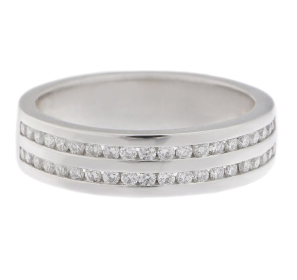 A classic two row round brilliant cut diamond channel set eternity ring.