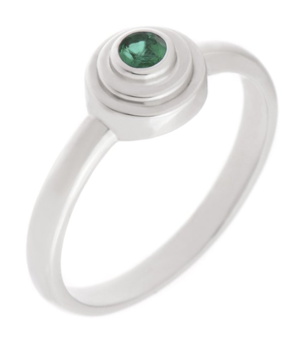 A solitaire round emerald dress ring with art deco style steps surround.