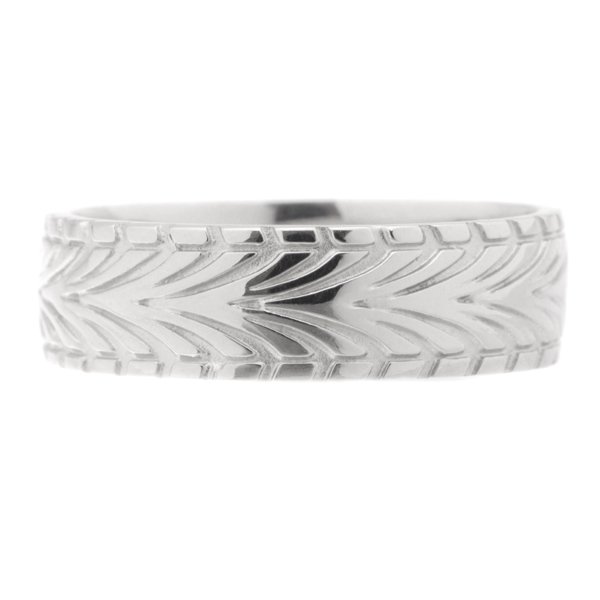 A designer car tyre tread style gents wedding band. The ring width measures 7mm.