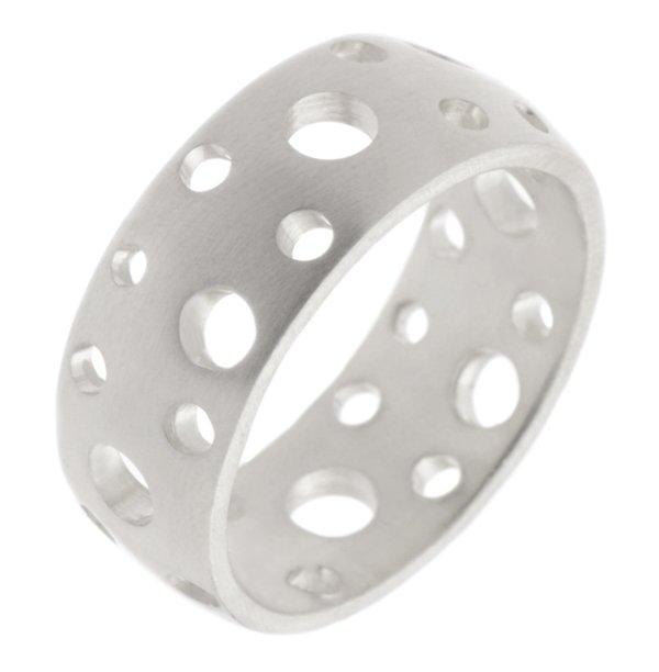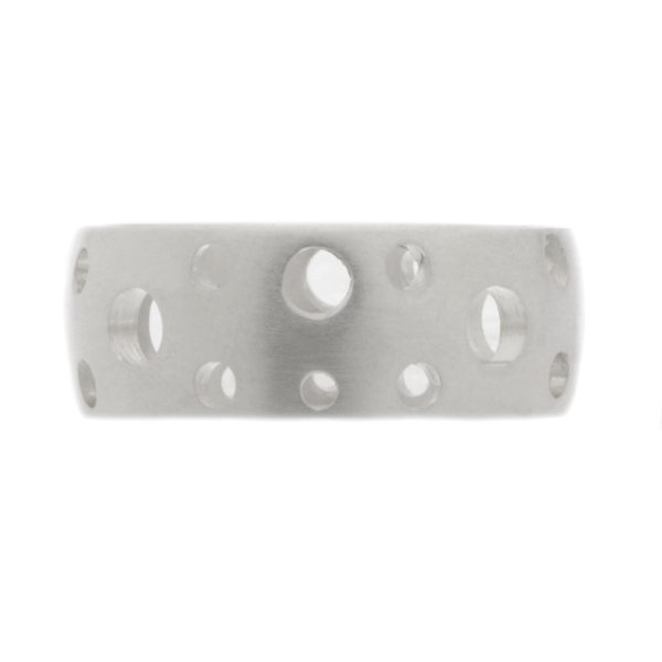 A modernist, contemporary designer gents wedding band with holes or 'bubbles'.