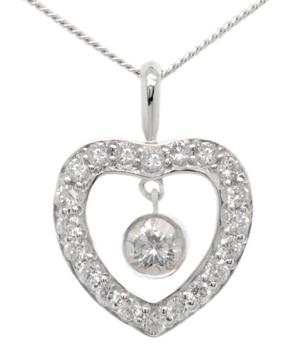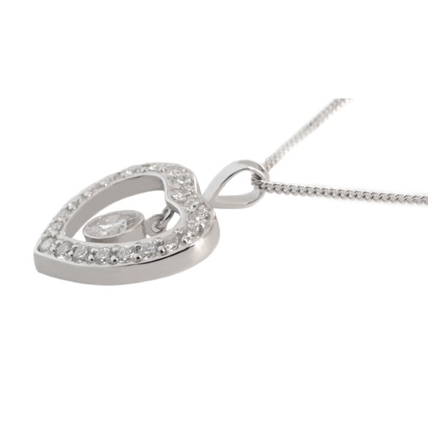 A heart shaped pendant with grain set round brilliant cut diamonds with a solitaire round brilliant diamond suspended in the centre. The hanging diamond has independant movement and a single bail or loop.