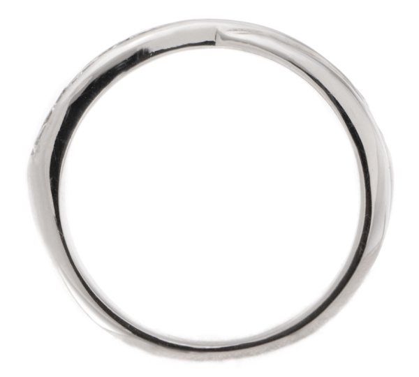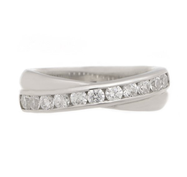 A modern design crossover style ring with channel set round brilliant cut diamonds.