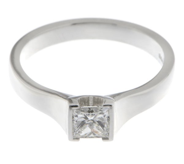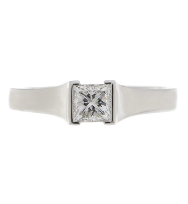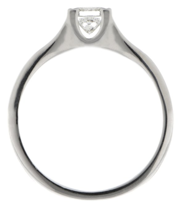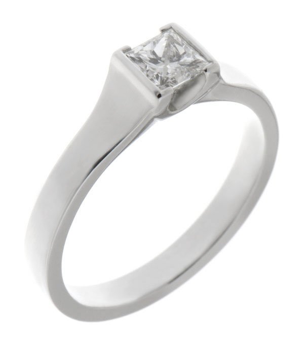 A modern design engagement ring with a solitaire princess cut diamond with flat shoulders and a semi rubover setting.