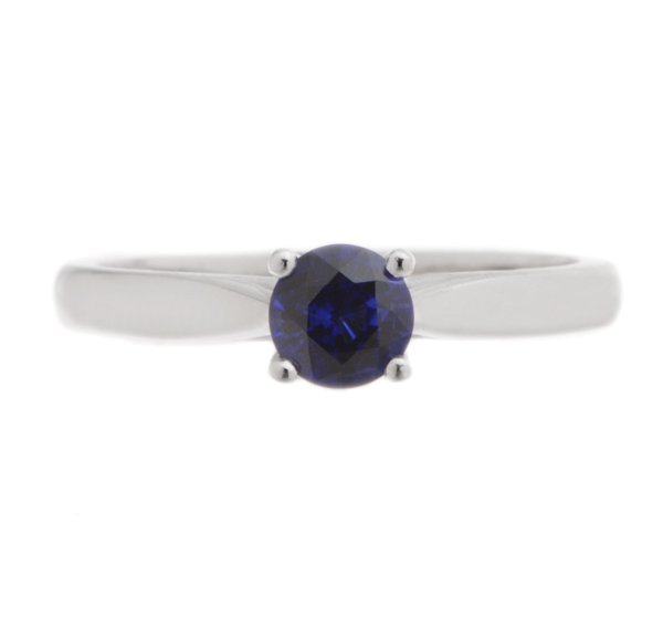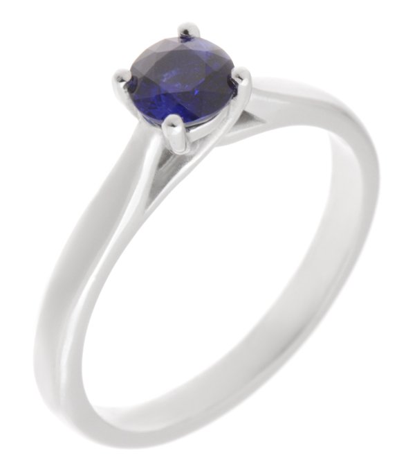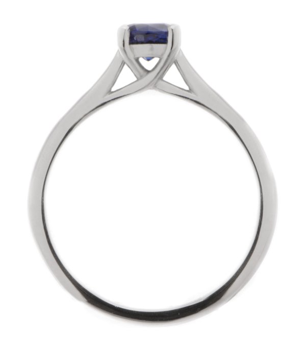 An elegant solitaire round blue sapphire ring with a kiss style crossover under setting.