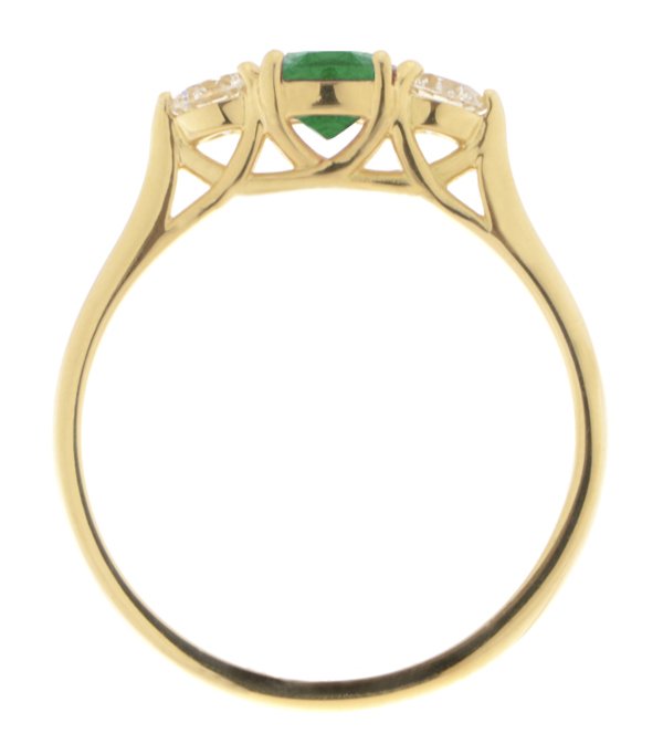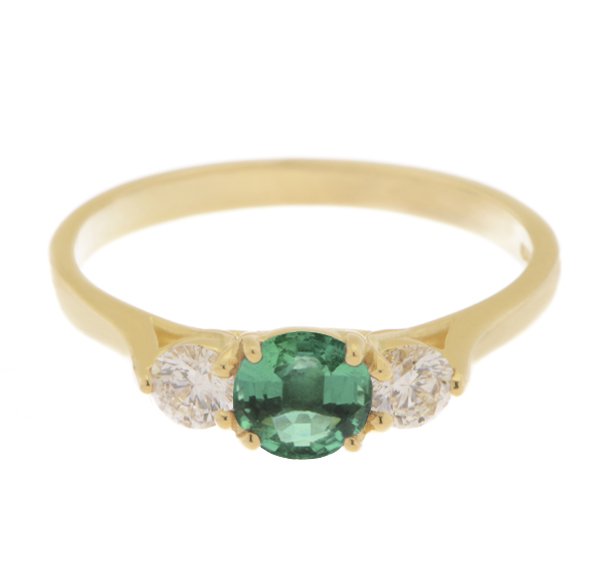 An elegant trilogy style ring with four claws to the centre round emerald stone and a three claw setting to the side round diamonds with a kiss design to the undersetting.