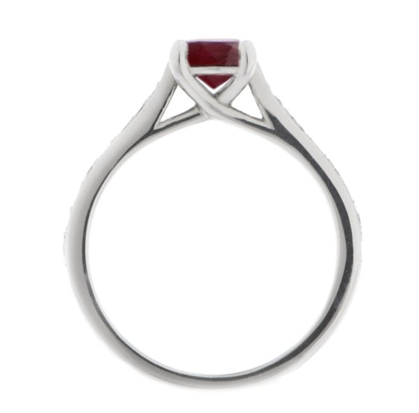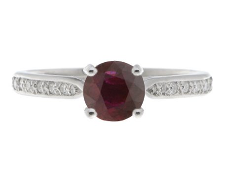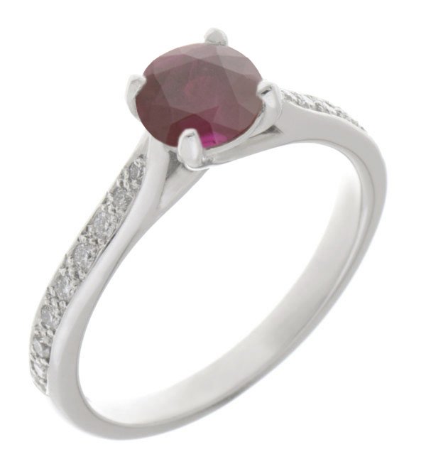 An elegant solitaire round ruby ring with grain set round brilliant diamonds set into the band with a kiss style crossover under setting design.
