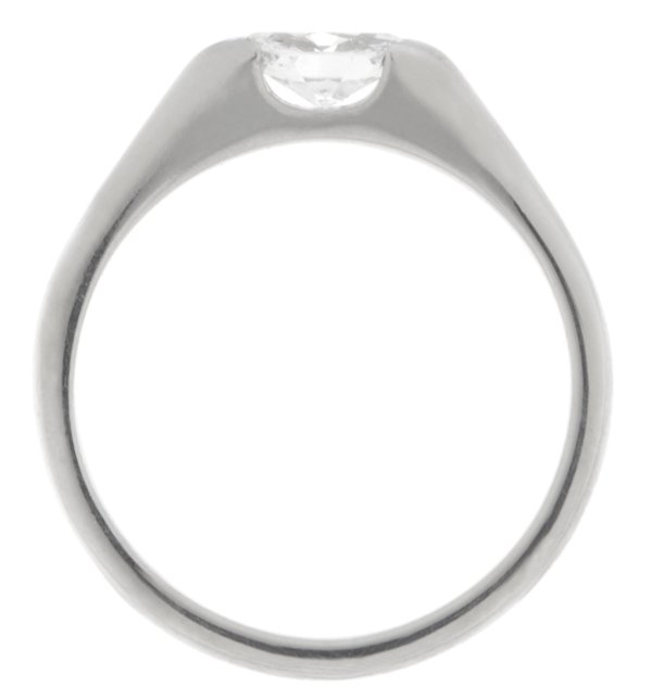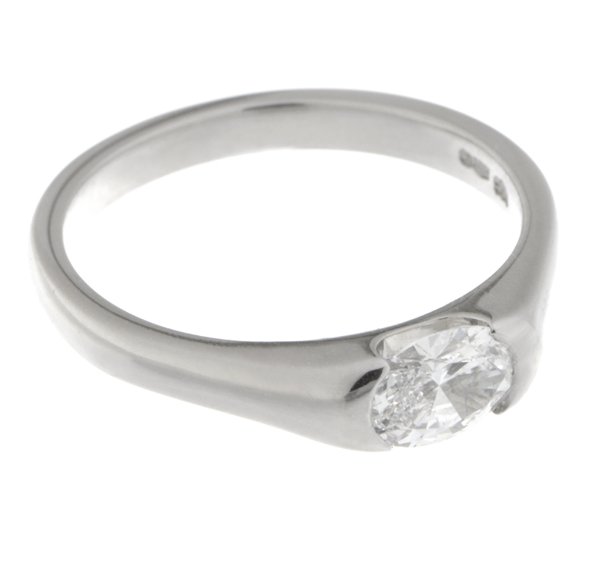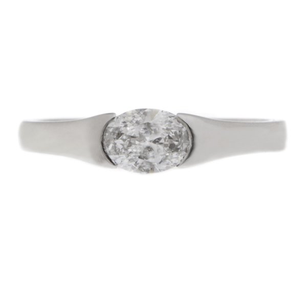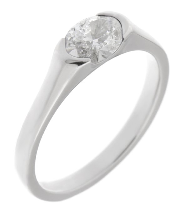 A modernist design engagement ring with a solitaire oval cut diamond, court shape shoulders and a semi rubover setting.