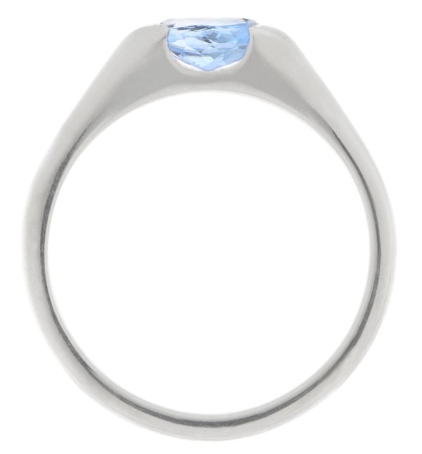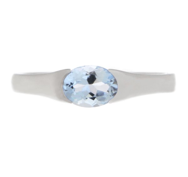 A modernist, contemporary design ring with a solitaire oval shape aquamarine, court shape shoulders and a semi rubover or rubbed over setting.