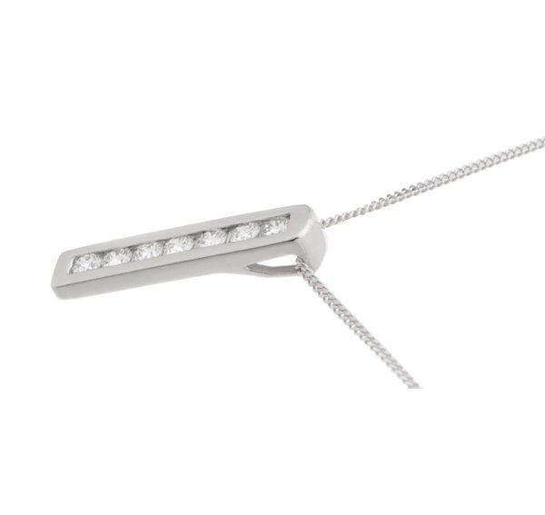 A modernist, contemporary style stick pendant with seven channel set round brilliant cut diamonds and a hidden chain loop.