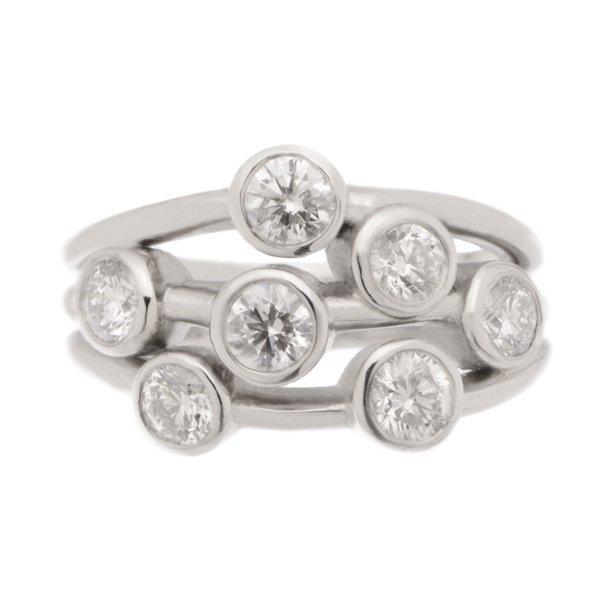 A modern contemporary scatter style cluster ring with rubbed over round brilliant cut diamonds.