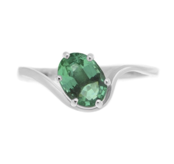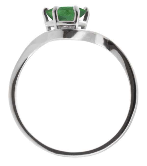 A modern, contemporary solitaire oval emerald ring with a six claw setting and a wrap around, crossover style design.