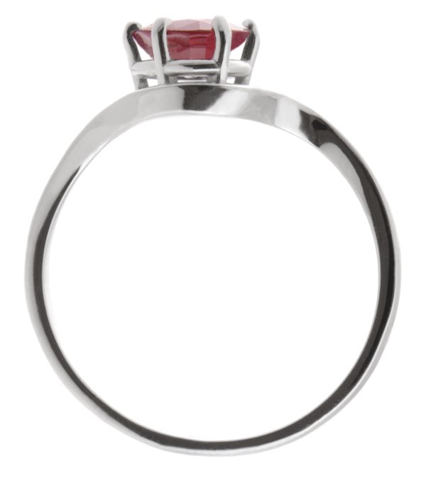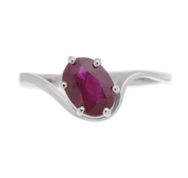 A modern, contemporary solitaire oval ruby ring with a six claw setting and a wrap around, crossover style design.