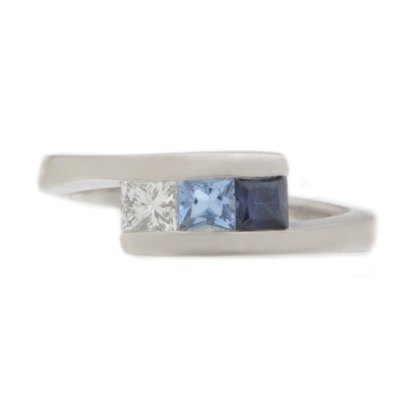 A modernist design trilogy crossover style ring with gradient in colour using a princess cut diamond, a square cut aquamarine and a square cut blue sapphire.
