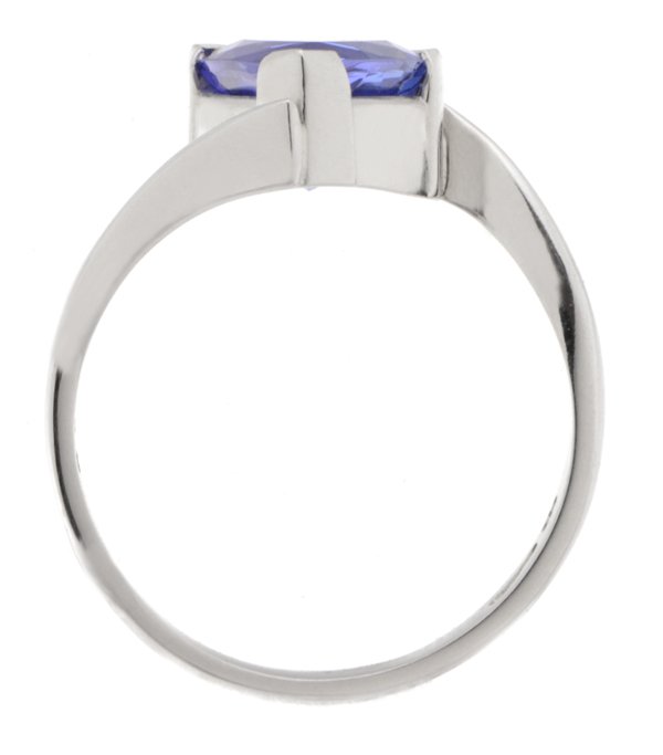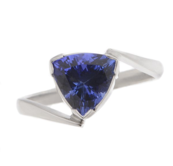 A modernist crossover style ring with a trillion or trilliant cut tanzanite, heavy setting with a slim band.