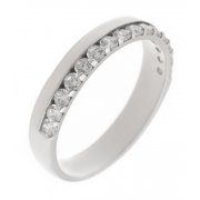 A classic court shaped diamond eternity ring with channel set round brilliant cut diamonds set to one side or edge of the ring.