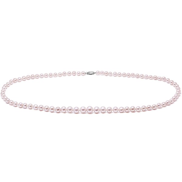 A graduated round pink freshwater cultured pearl pendant necklace with an oval ball clasp in white or yellow gold.