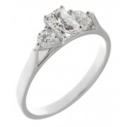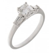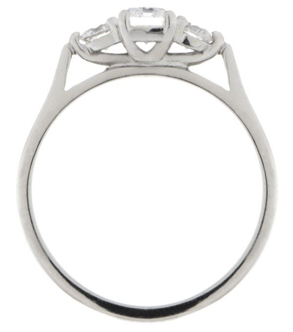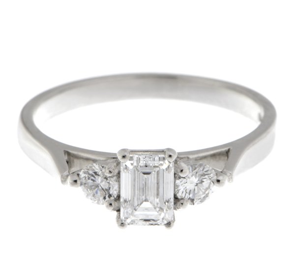 An elegant trilogy ring with an emerald cut diamond centre stone set with four claws and round brilliant cut diamond side stones with three claws and split shoulders.