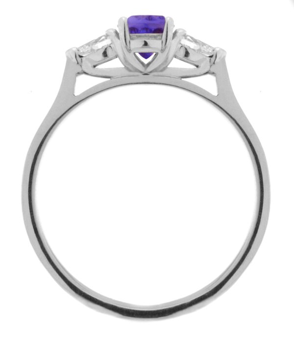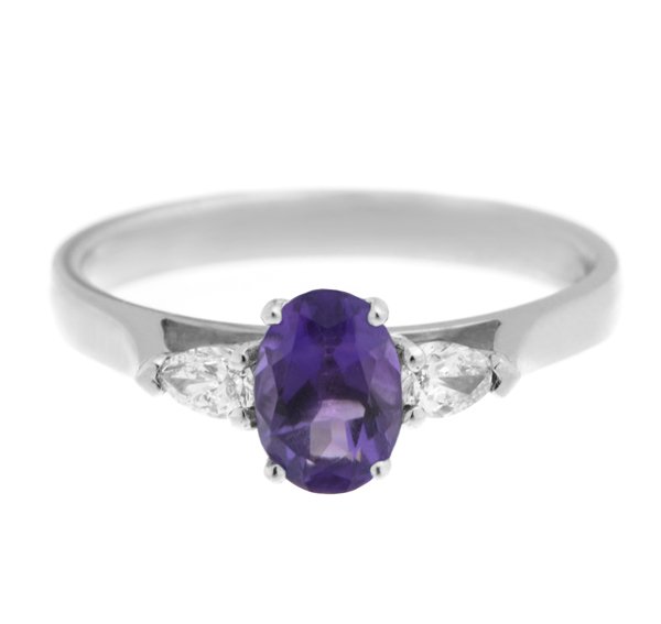 A classic, claw set oval shape amethyst trilogy ring with two pear shape diamonds set with three claws to either side.
