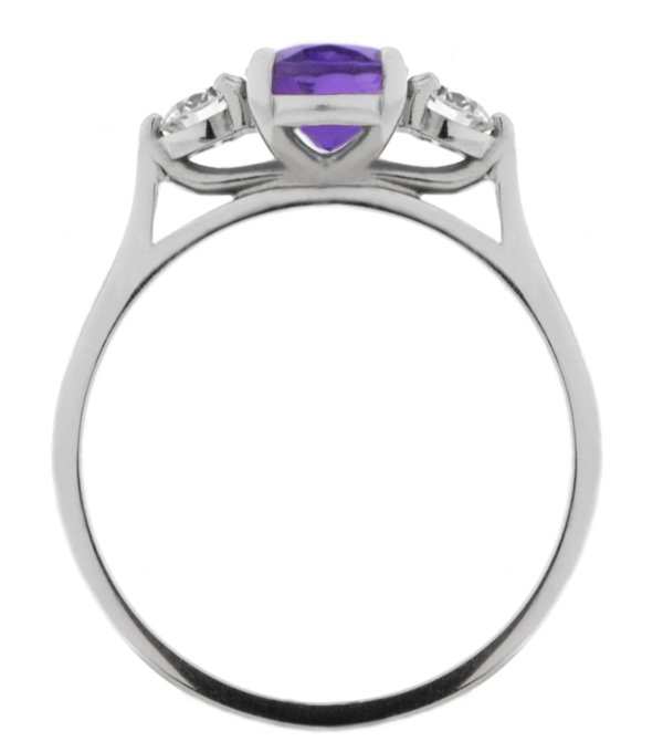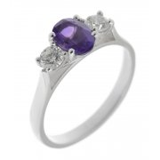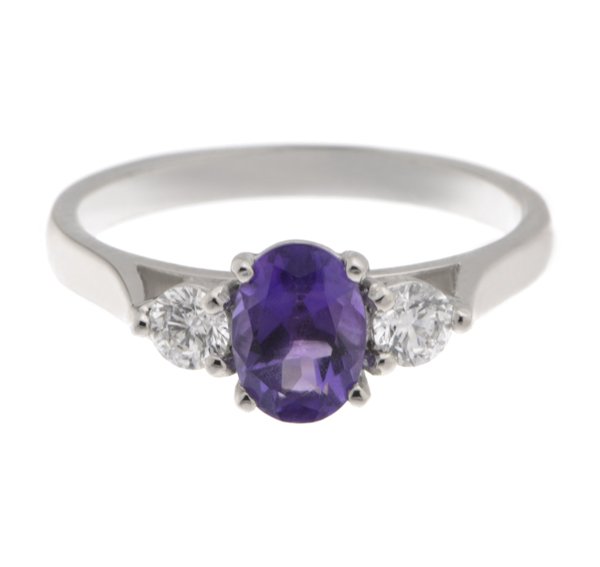 A classic, claw set oval shape amethyst trilogy ring with two round brilliant cut diamonds set with three claws to either side.