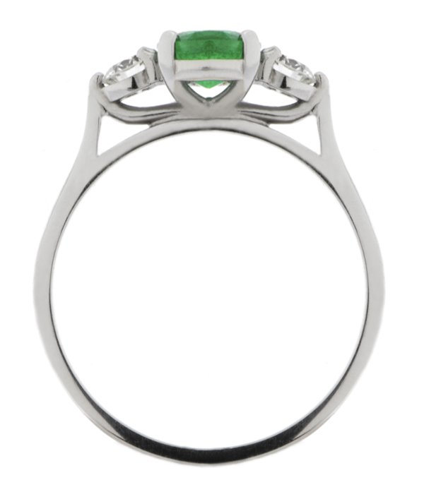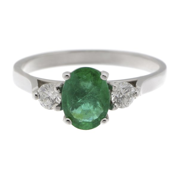 A classic, claw set oval shape green emerald trilogy ring with two round brilliant cut diamonds set with three claws to either side.