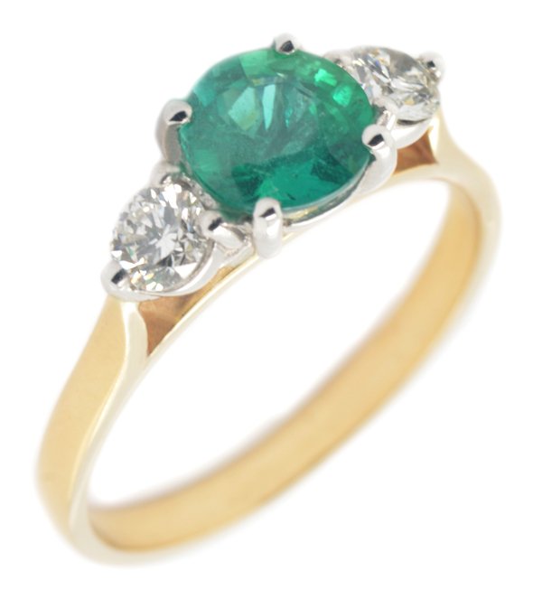 Round Emerald 1.05ct (6.6mm) with 2x 0.20ct (3.8mm) F/G colur, VS clarity diamonds with 0.40ct total diamond weight.