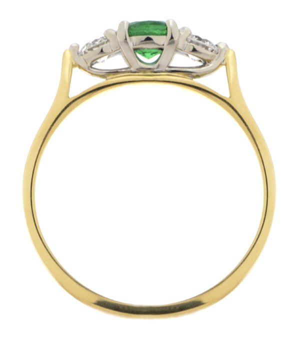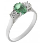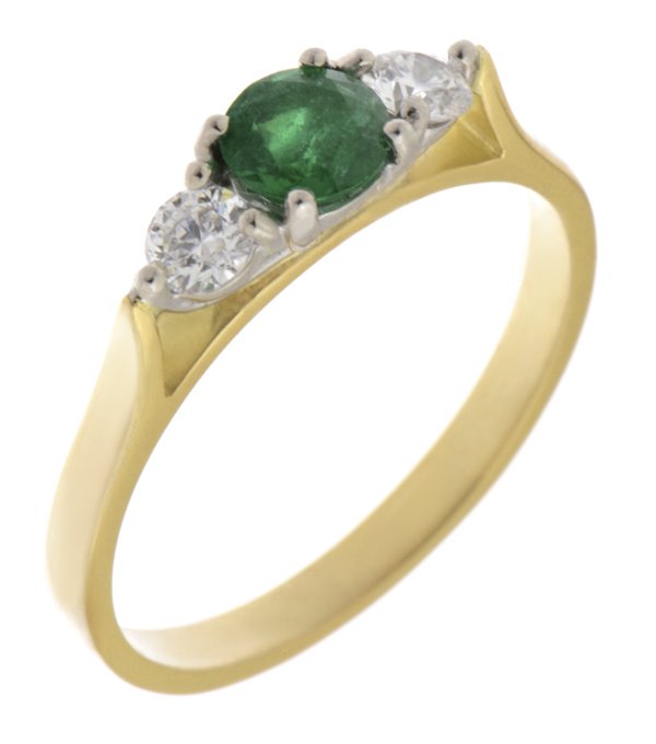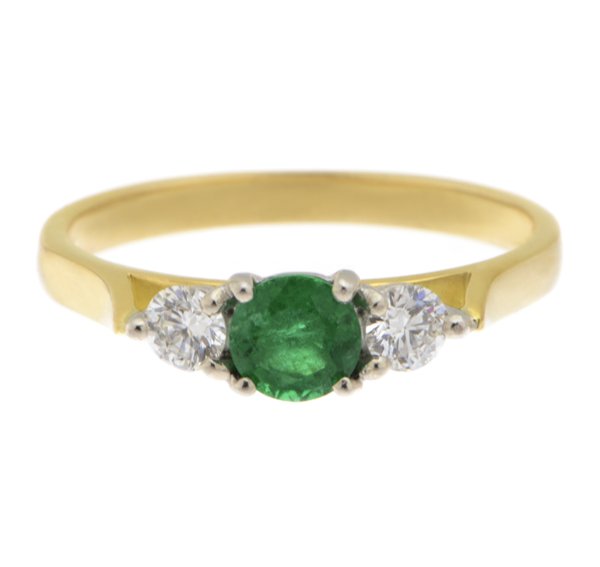 A classic, claw set round cut green emerald trilogy ring with two round brilliant cut diamonds set with three claws to either side.