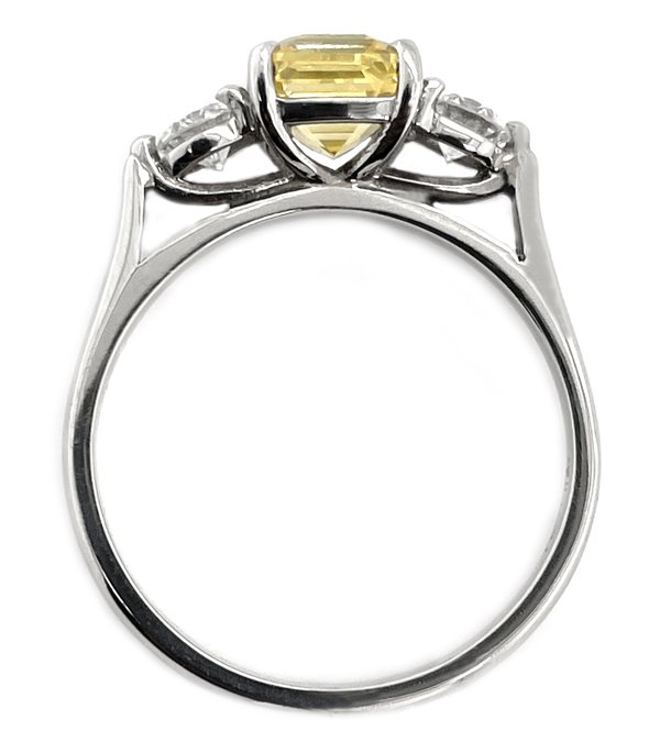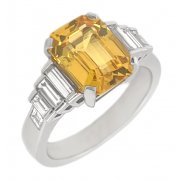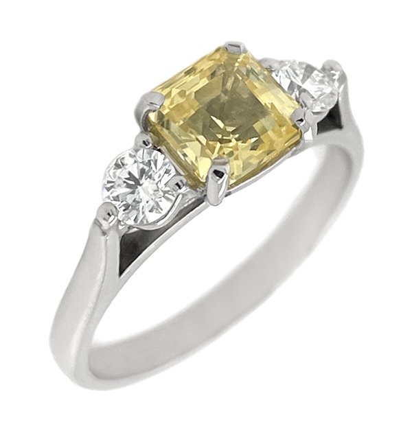 A classic, claw set square octagon or Asscher cut yellow sapphire trilogy ring with two round brilliant cut diamonds set with three claws to either side.