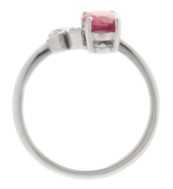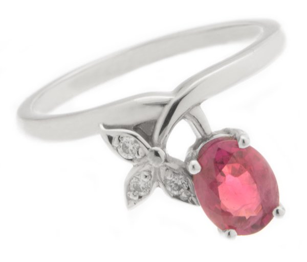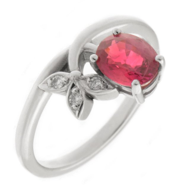 A modern, designer style ring with an oval ruby main stone and round diamond set leaf or petal accents.
