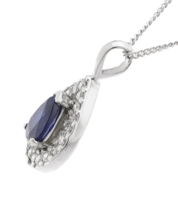 A classic pear cut blue sapphire drop pendant with a halo of grain set round brilliant cut diamonds and a single bail loop.