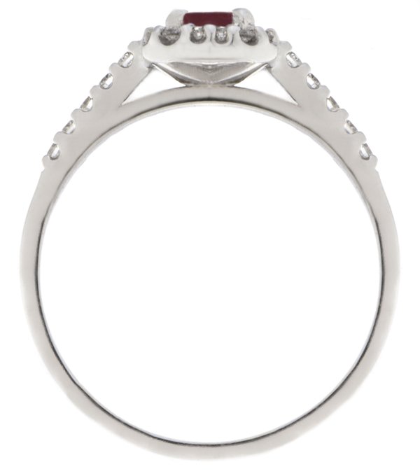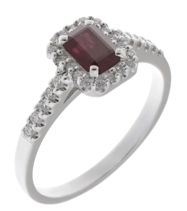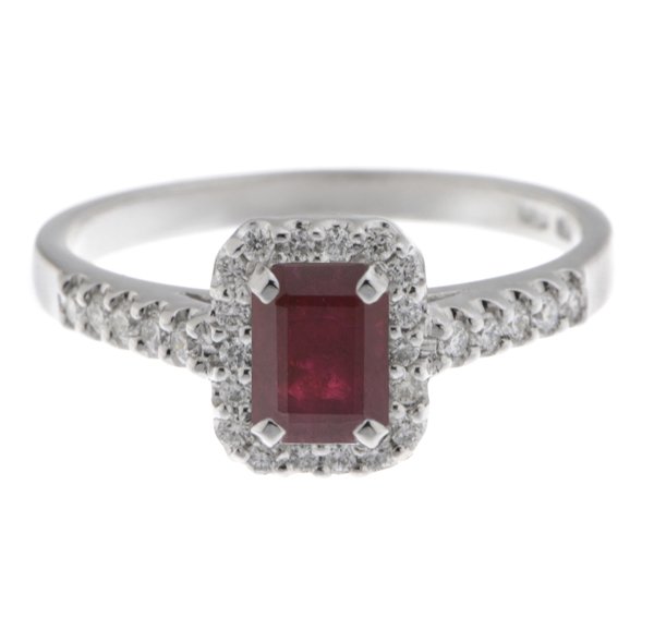 A classic halo style cluster ring with a 1920's art deco style, a claw set emerald cut ruby centre stone and round brilliant cut diamonds set in to the surround and shoulders.