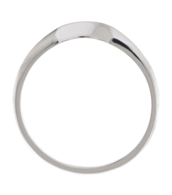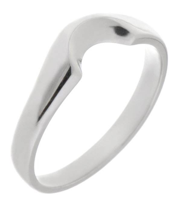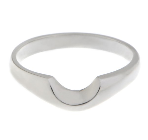 A shaped wedding band with an oval shaped cut out designed to fit next to, around another ring.