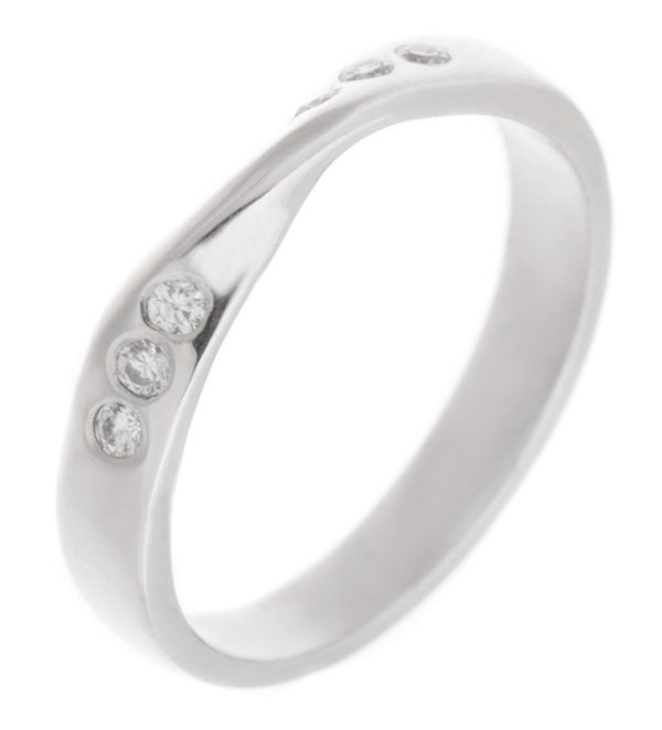 A modern, contemporary ring with a twist ribbon shaped design, a court profile and six round brilliant cut burnished set diamonds. The overall width is approximately 3mm.