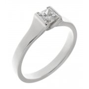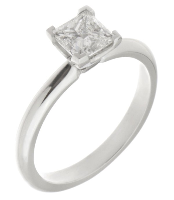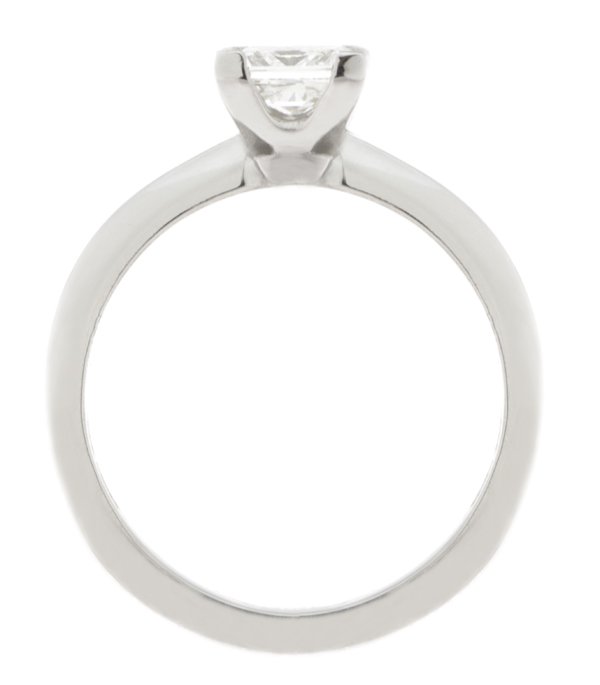 An elegant solitaire princess cut diamond engagement ring set with four L shaped claws, U shaped undersetting and solid tapered shoulders.
