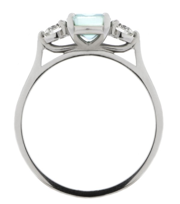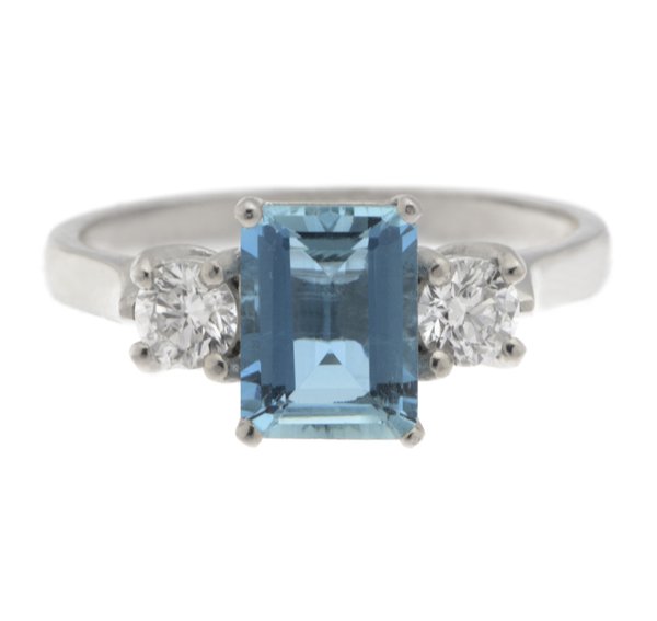 A classic, claw set octagon aquamarine or aqua trilogy ring with two round brilliant cut diamonds set with four claws to either side.